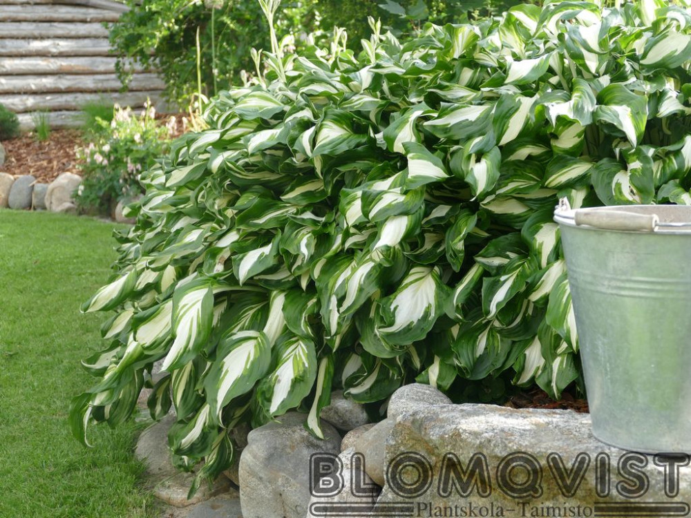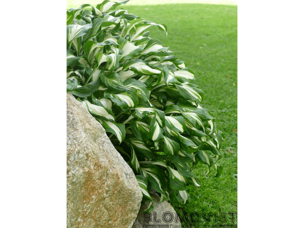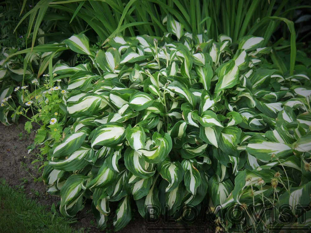 Grön-vit-gul randiga blad. En omtyckt sort som bildar ganska breda, låga tuvor med tiden.
